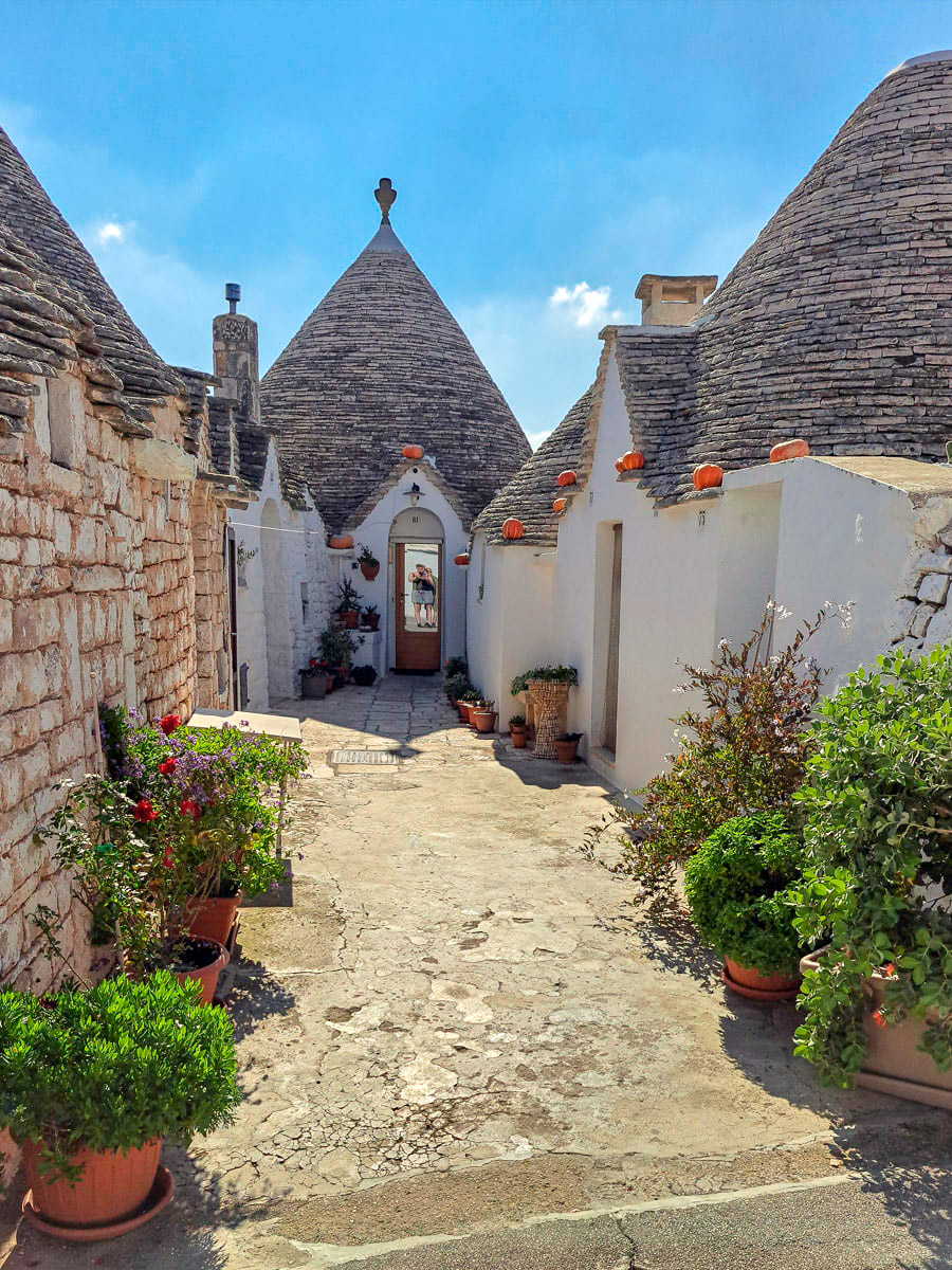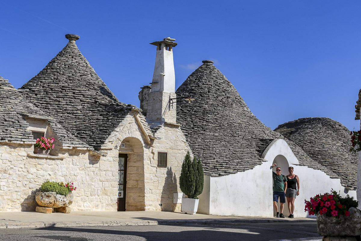 Vanaf Matera was het een uurtje rijden en dan boeken we gewoon een nachtje extra in het appartement. In Valle d’Itria staan deze betoverende trulli woningen. Dit zijn witte huisjes met een kegelvormig dak. Het oude centrum van Alberobello bestaat uit kronkelige straatjes waarlangs meer dan duizend traditionele ronde witte huisjes staan.