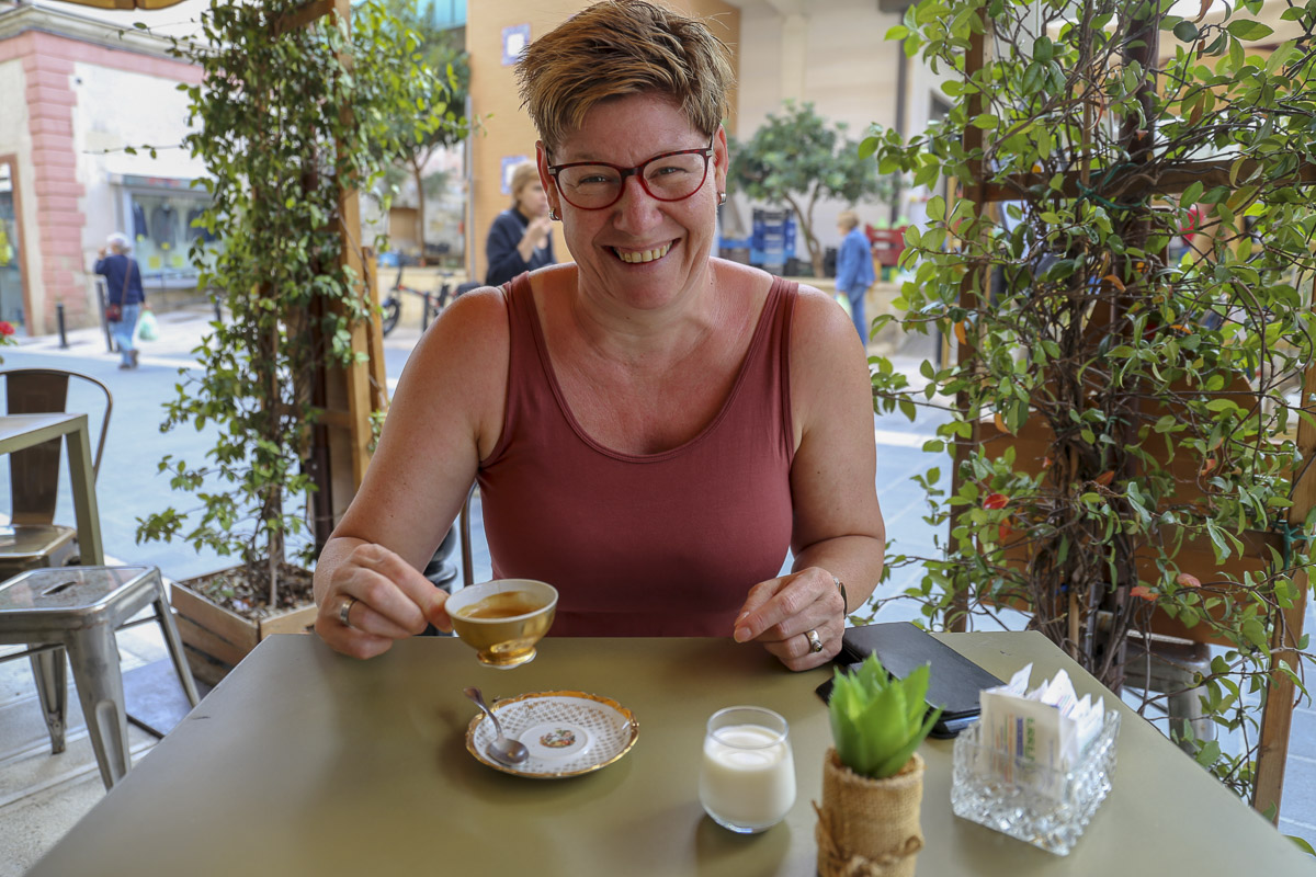 Bij het begin van Sassi di Matera probeer ik een rondwandeling te vinden en deze op mijn gps te krijgen. Dat lukt niet, want er blijkt geen verbinding tussen de telefoon en gps te zijn. We hebben daar maar meteen ons eerste bakje koffie gedronken. De bediening bleek blijkbaar geen Engels te spreken, waardoor de grote bak koffie een espresso werd. Maar gelukkig sprak de dame die de koffie bracht wel Engels en die nam de kleine espresso van mij weer mee en kwam er een grote koffie voor terug. Karin kreeg haar espresso in een heerlijk kitscherig kopje.