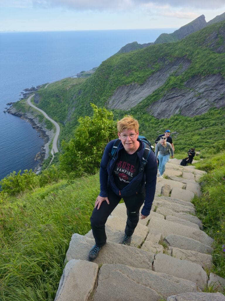 Hier idem: zweten, hijgen, puffen. Maar wát een uitzicht als je boven komt! Reine en de omliggende Lofoten liggen aan je voeten in een panorama dat alle moeite waard is.